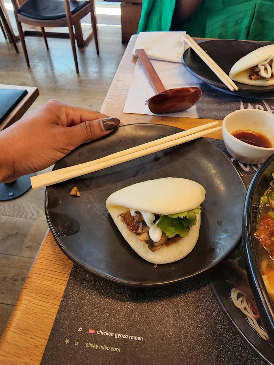 Don’t miss out on the signature Edamame - steamed soybeans lightly salted and the perfect appetizer to start your meal. If you're craving something lighter, the Mushroom and Aubergine Steamed Buns are a fantastic choice, offering a delicate balance of flavors. The restaurant also caters to those with a sweet tooth, serving delicious desserts like the Banana Katsu, a fried banana with a sweet, crispy coating.